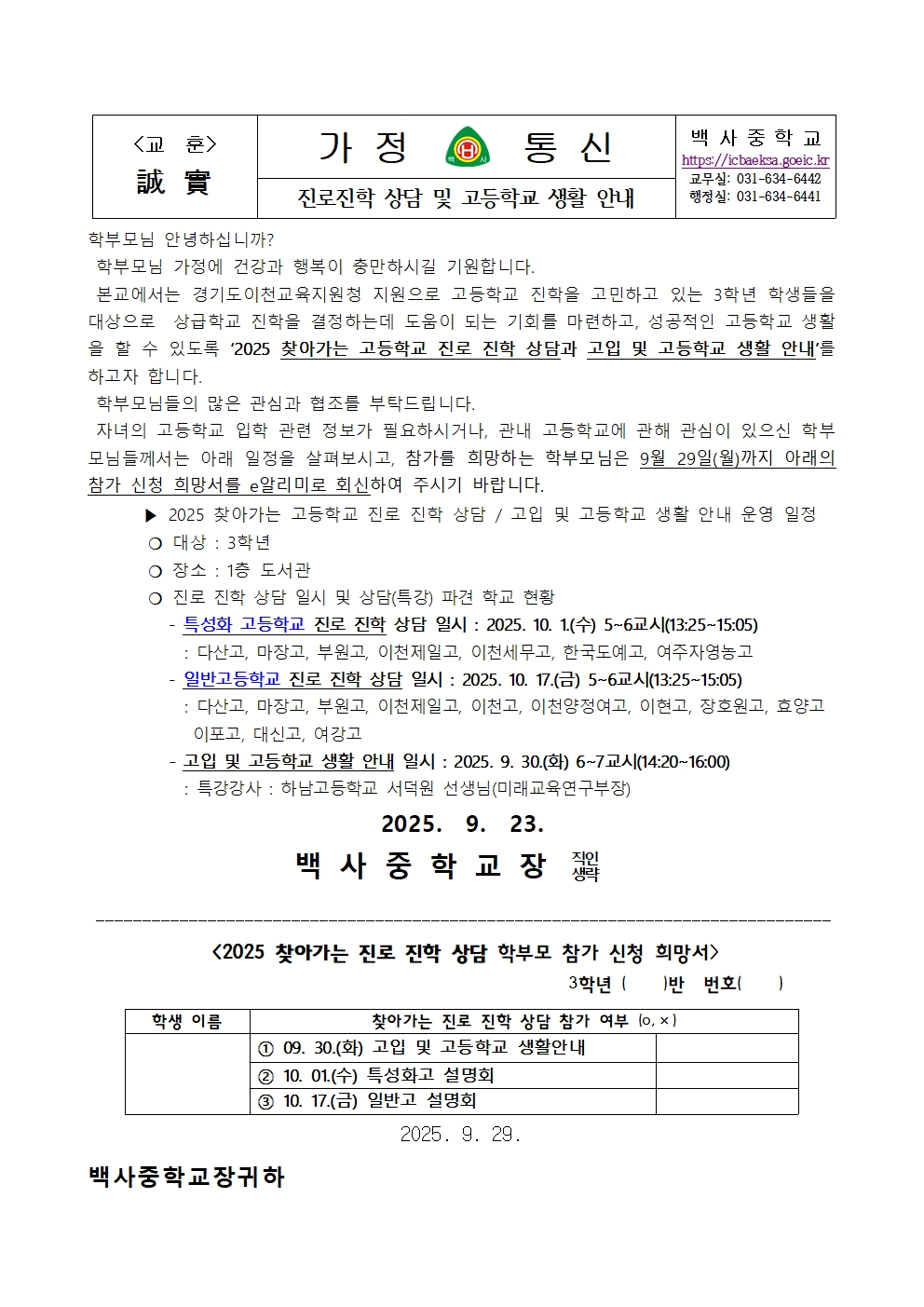 진로진학 상담 설명회 및 고입, 고등학교 생활 특강 학부모 참석 안내