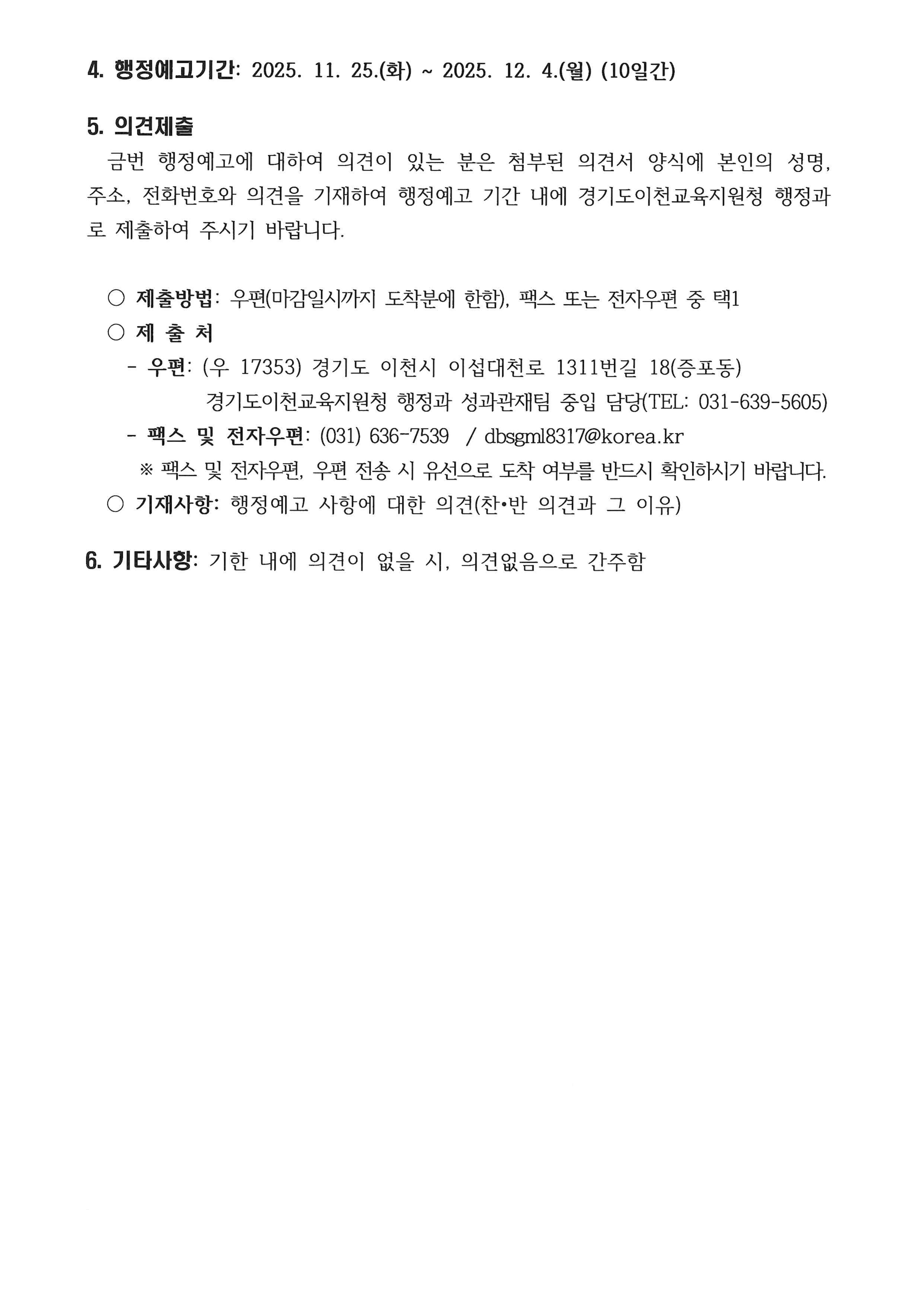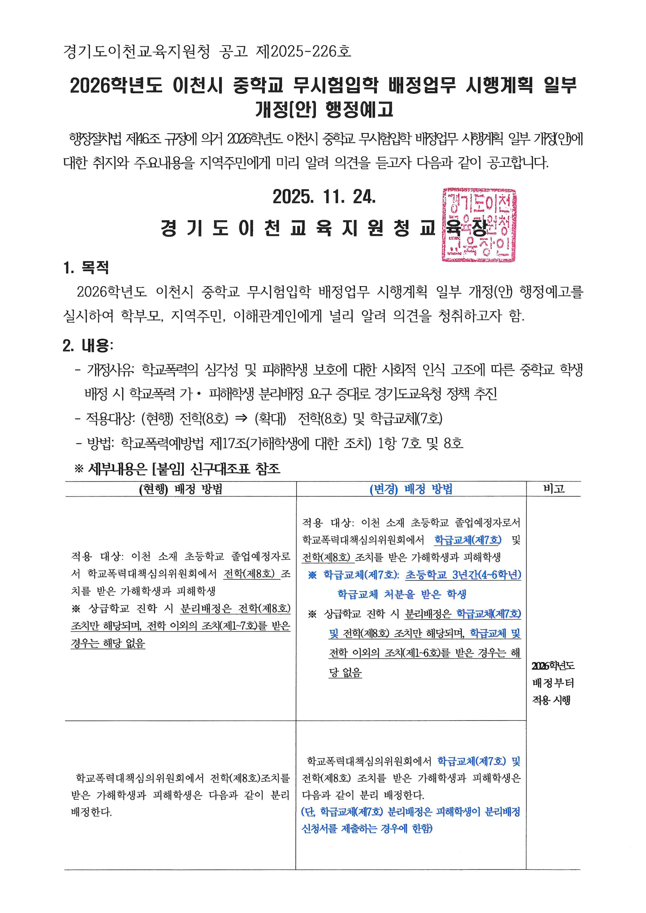2. 2026학년도 이천시 중학교 무시험입학 배정업무 시행계획 일부 개정(안)의 취지와 내용을 학부모ㆍ지역주민 및 교육수요자에게 사전에 안내하고, 중학교 학생 배치에 관한 폭넓은 의견을 수렴하고자 다음과 같이 행정예고를 실시하오니 의견이 있으신 분은 제출방법을 확인하시어 제출해주시기 바랍니다.