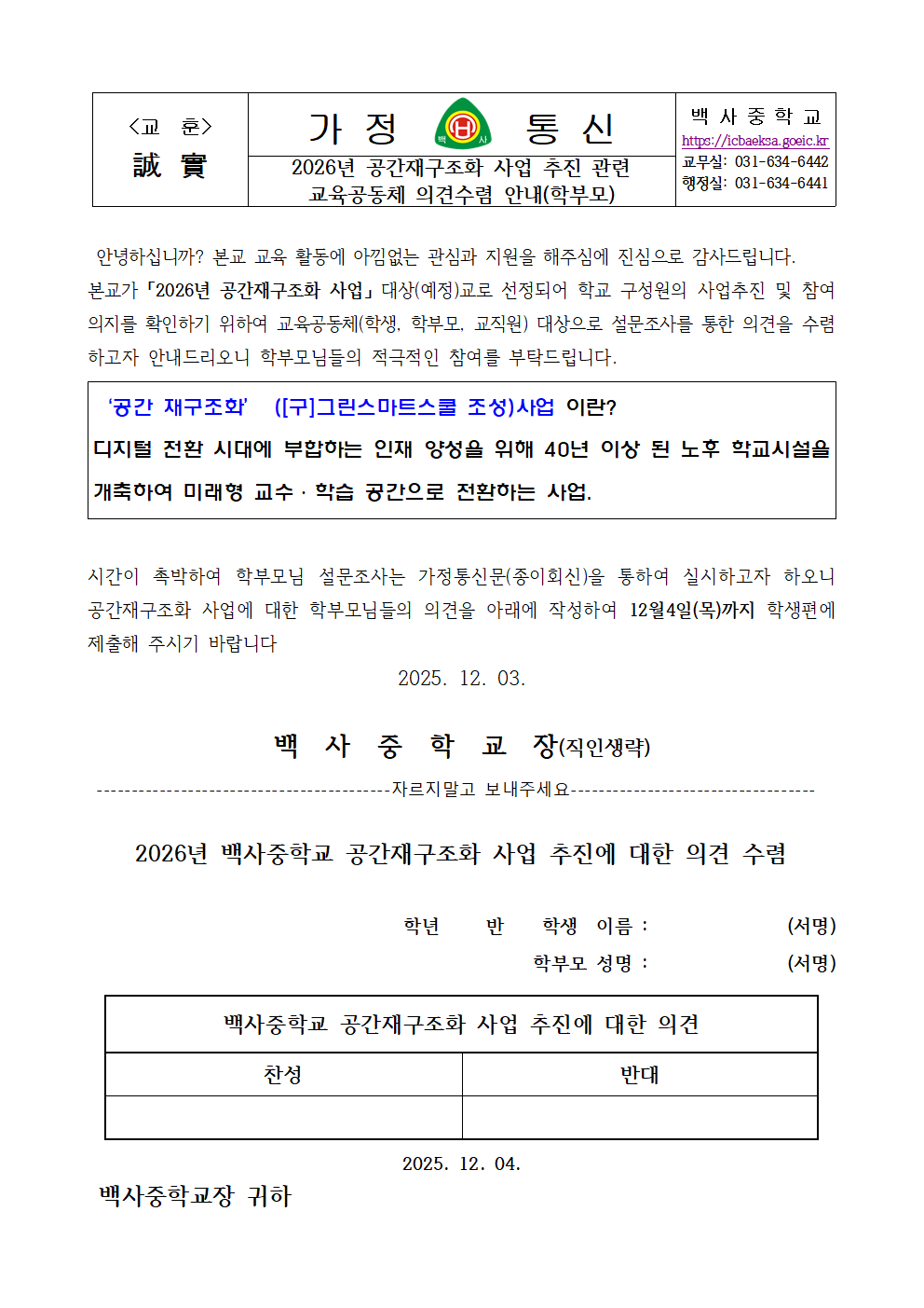 2026년 공간재구조화 사업 추진 관련 교육공동체 의견 수렴 안내